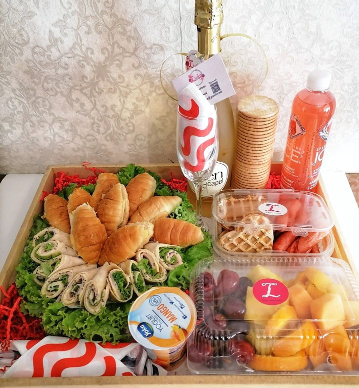 Caja de desayuno personalizada, con frutas, embutidos y bebida. Perfecta para cumpleaños y dias especiales.